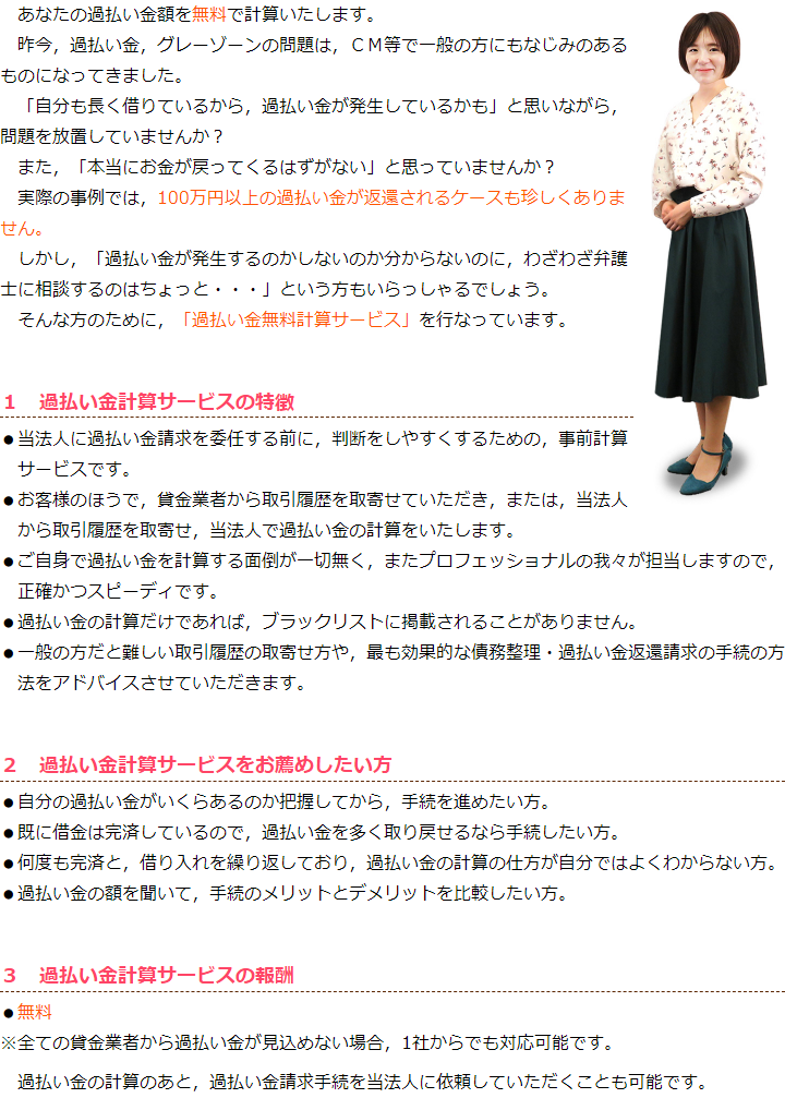 当法人が行っている過払い金無料診断サービスは、過去に借金をしていて、もしかしたら過払い金があるかもしれないと思われている方に気軽にご利用いただけるサービスです。